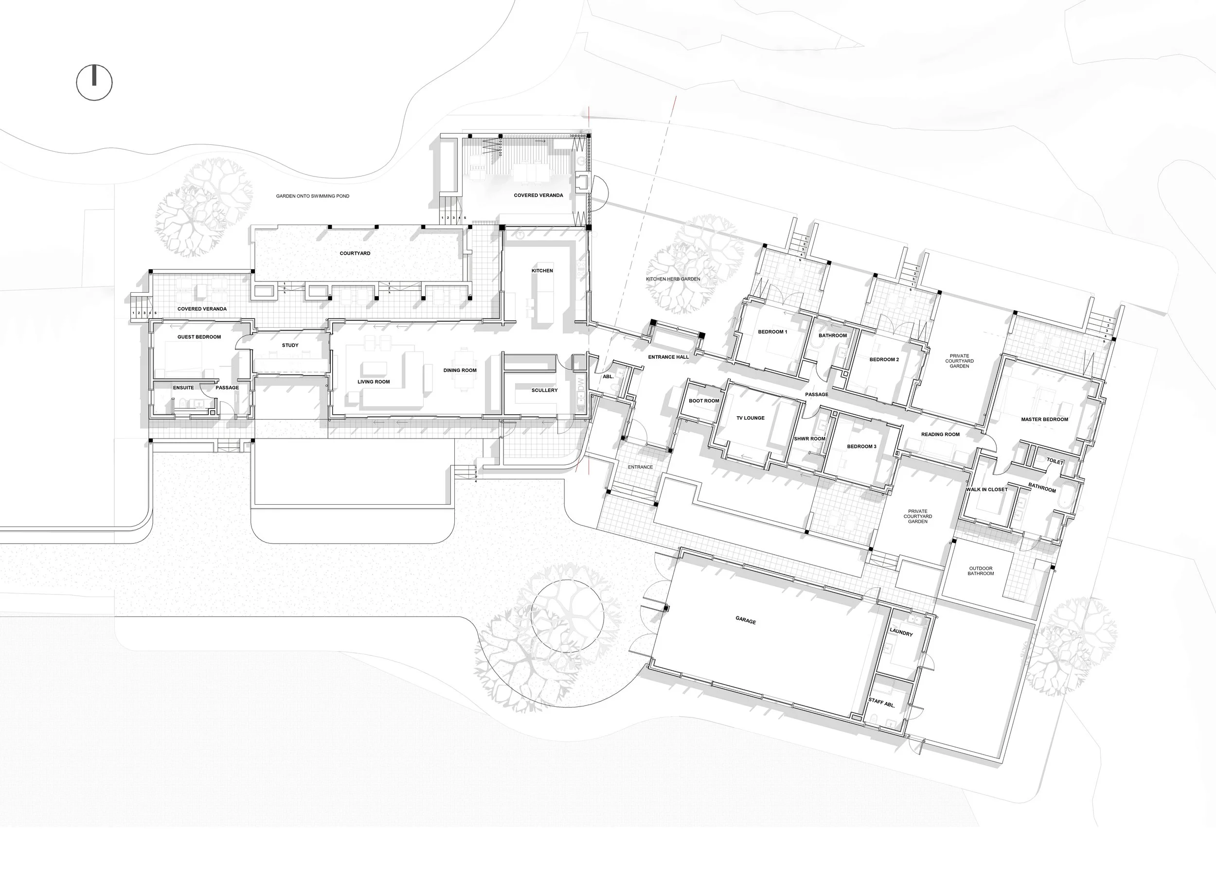 Fairview Estates, BallitoFarm Lewis 01 is the primary family home set on a 6Ha farm, within an Eco Farm Estate. The house is completely off-grid, and is made of natural stone and timber materials. Every room connects you directly to nature - a kitchen herb garden, a private bedroom courtyard or the central natural swimming pond.