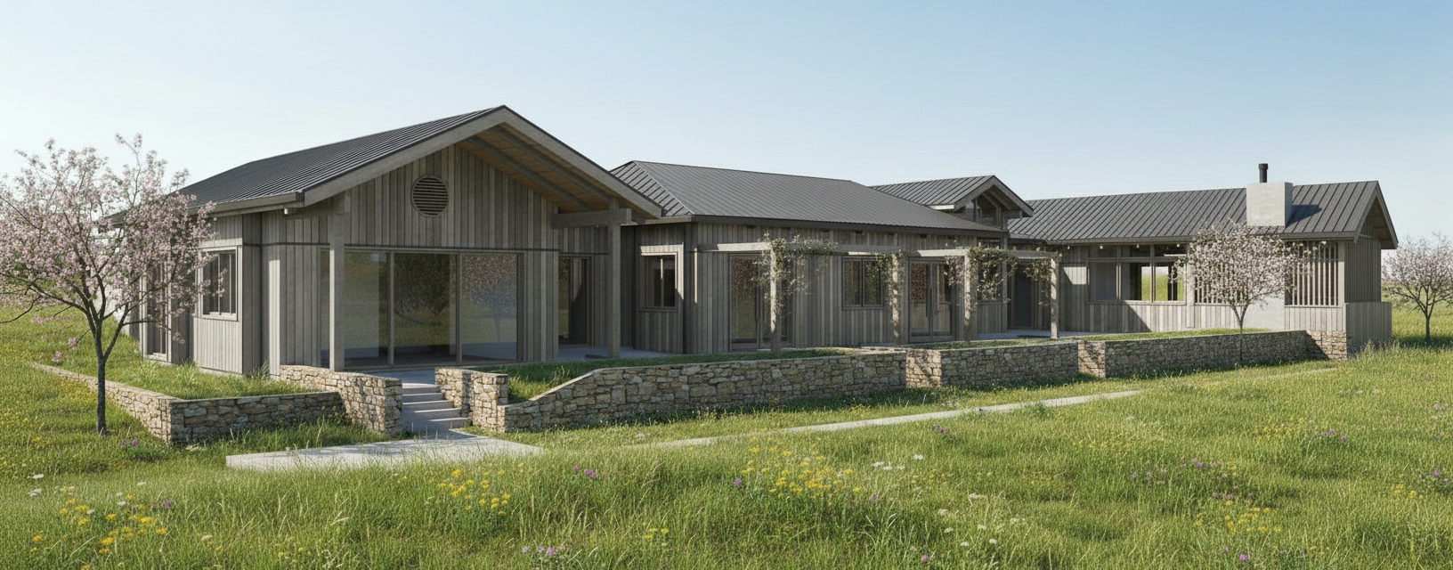 The two houses sit within the farm landscape, deeply connected to nature.